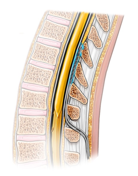 • A small electrode is inserted near the spinal cord, into the epidural space (the same space used for epidural anesthesia during childbirth).